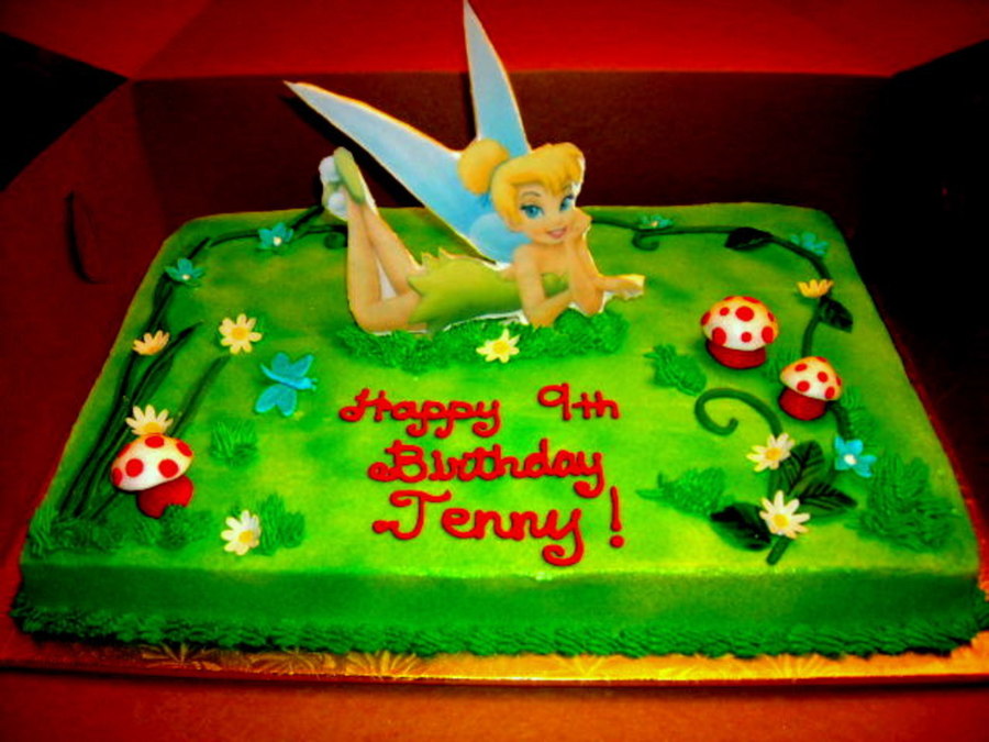1/2 Sheet Marble Cake with Whipped Frosting. Edible Image attached to a white Chocolate Stand. Mushrooms, Flowers, Insects and Vines are made of Fondant.