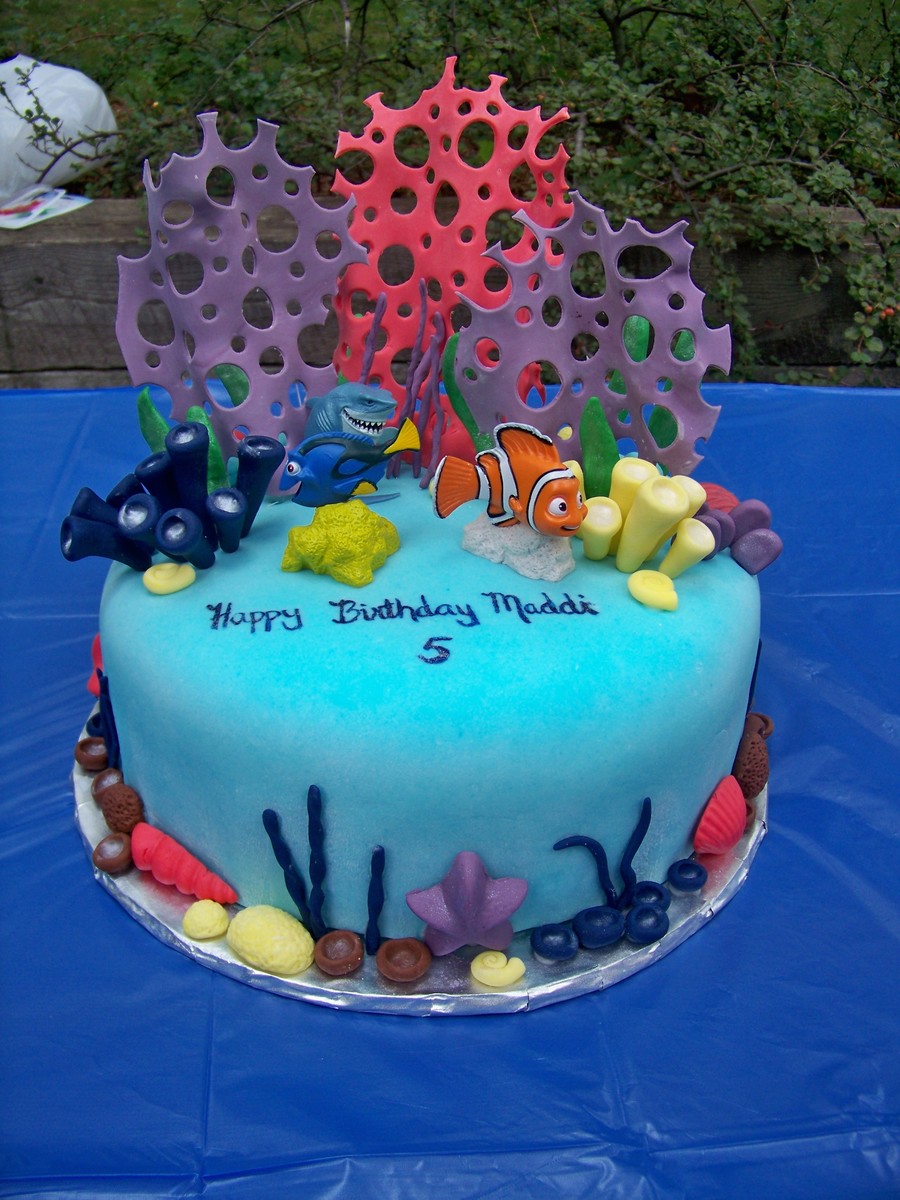 10" cake french vanilla cake covered with buttercream and MMF. Nemo, Dory and shark are toys. all other decorations are made out of MMF.