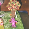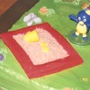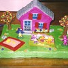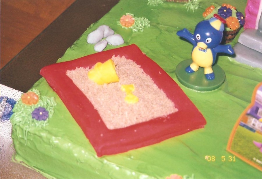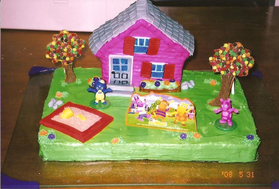 This cake was made from a sheet cake and from the wilton stand up house pan. All pieces on the house are made from fondant. The trees are made out of cookie that was covered in icing and topped with leaf sprinkles. The sandbox is made from fondant and brown sugar for the sand. The flower pot behind Pablo is made from a peanut butter cup that I drew on with black edible icing color pen and topped with icing and fondant flowers. The flower bed, rocks and all flowers are made from fondant. The figures are store bought.