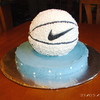 This is a round cake with a ball cake on top for the basketball made from the ball cake pan. It was iced with buttercream to look like a UNC basketball . The UNC symbol and Nike symbol are made from fondant.