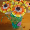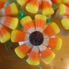 Chocolate/peanut butter cake pops dippen in white candy melts. Candy corn for petals & chocolate icing center