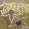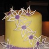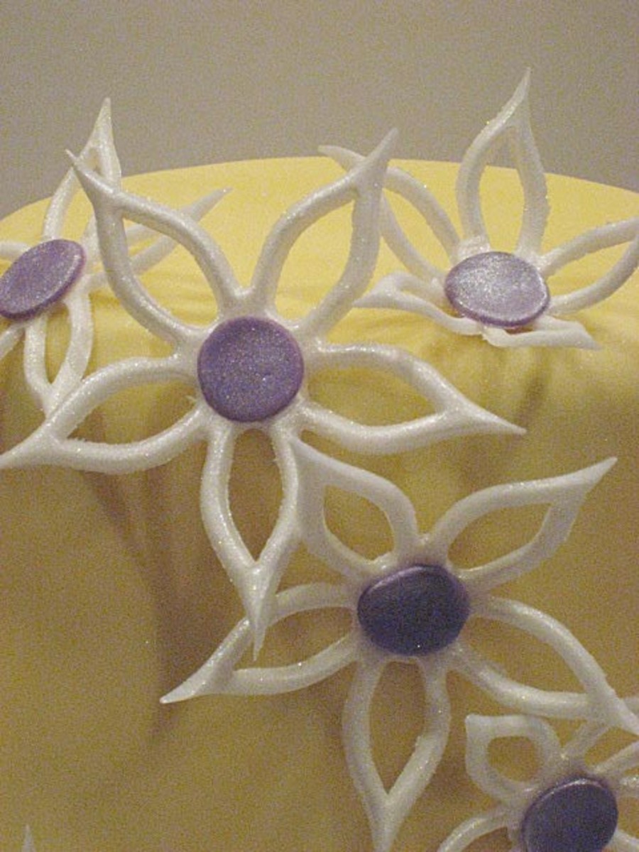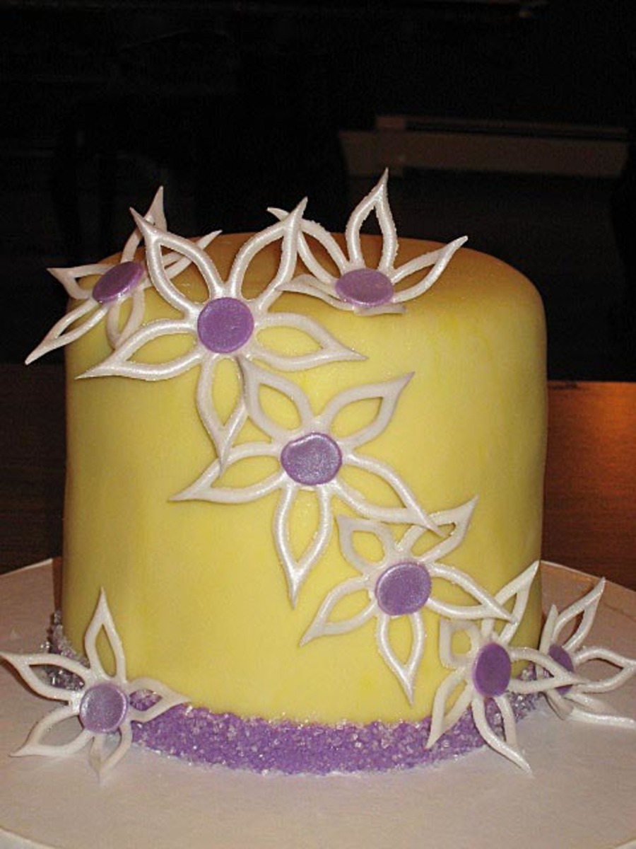 Hi! I used two 6 x 3 in. cakes with pineapple filling (receipe from here). It is covered in lemon fondarific. Flowers are fondant and the border on the bottom is fondant covered with white sugar crystals. Thanks for looking.