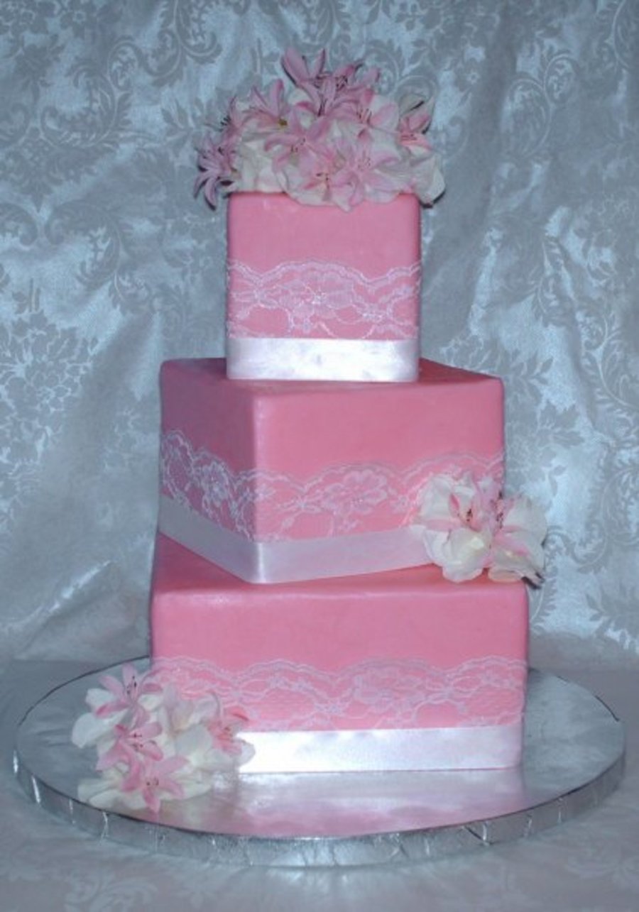 Cake is wrapped in a pretty pink fondant, then w/white lace, then a white satin ribbon. Flowers are mini bouquets of white silk hydrangea & soft pink peruvians. Thought this design was a nice "marriage" of modern and traditional. :)