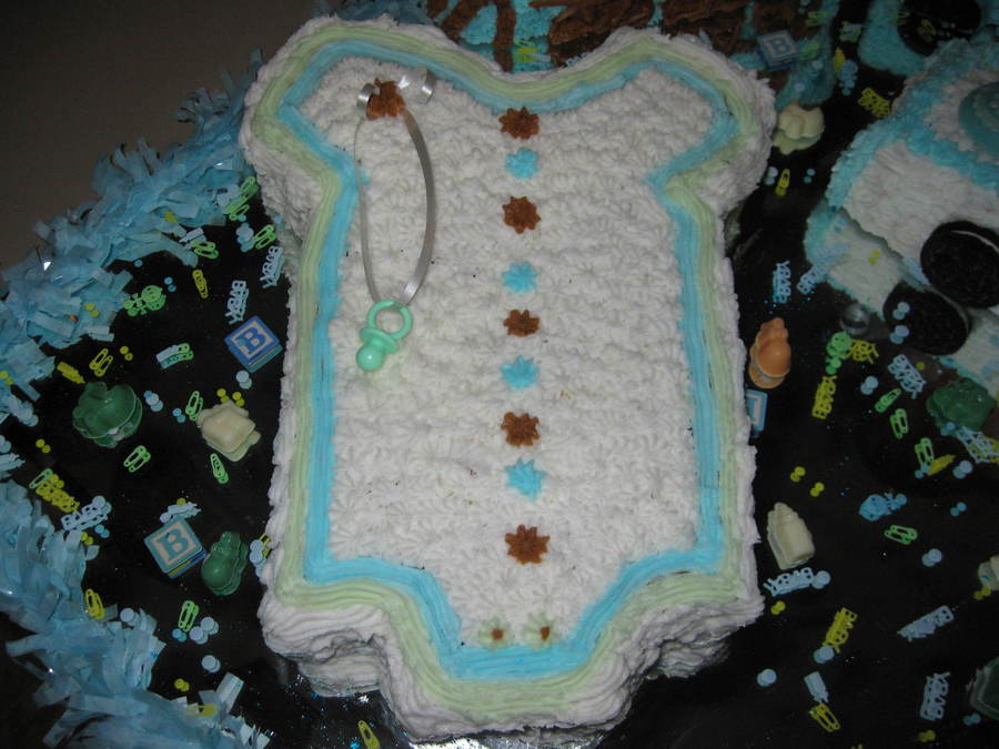 Baby shower cake for my future grandson made of yellow cake from scratch and buttercream frosting. Only used the choo-choo train and bottle mold.