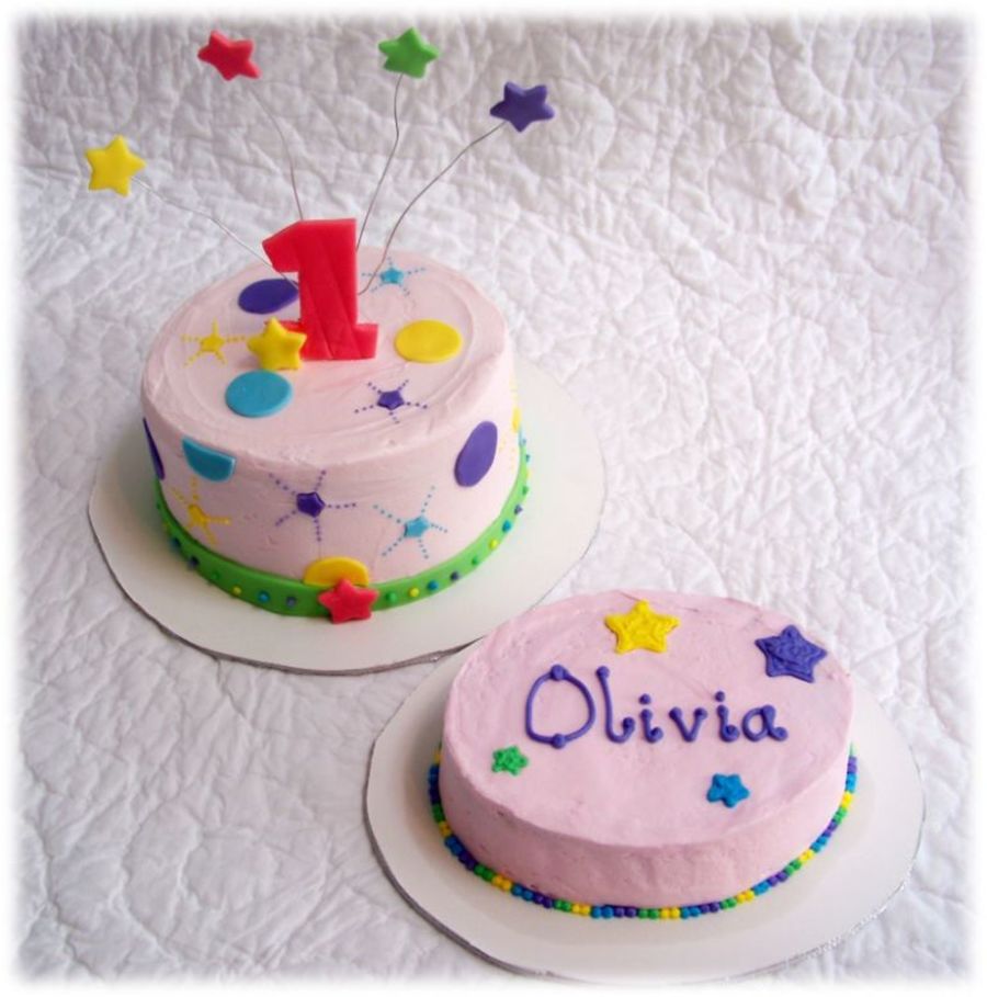 Based on "Wonderful One" birthday theme. Main cake is 8" chocolate cake with cookies & cream filling. Smash cake is chocolate cake, as well. Iced in buttercream with fondant accents and topper.