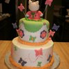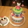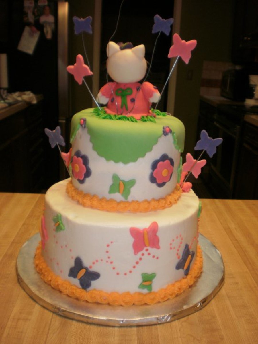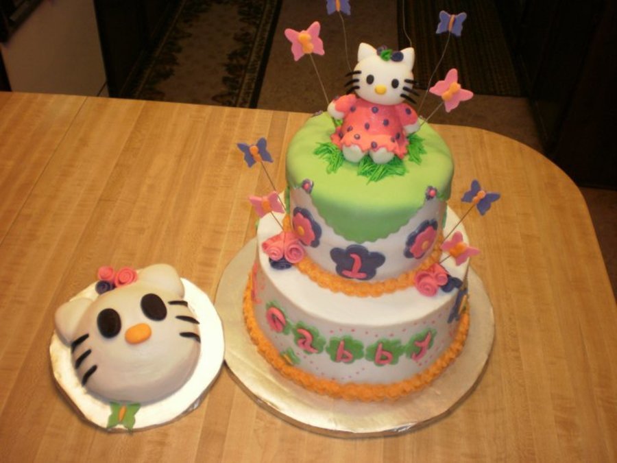 Buttercream finish with fondant and sugarpaste accents. Hello Kitty made of white modeling chocolate covered with fondant