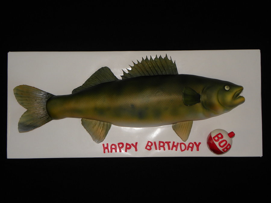 A GIANT walleye. Well it seemed that way anyway. Probably had about 15-20 servings. My 2nd attempt at a fish, this time using my new airbrush. All fondant with gumpaste fins and teeth. Bobber is made of RKT. Thanks for looking!