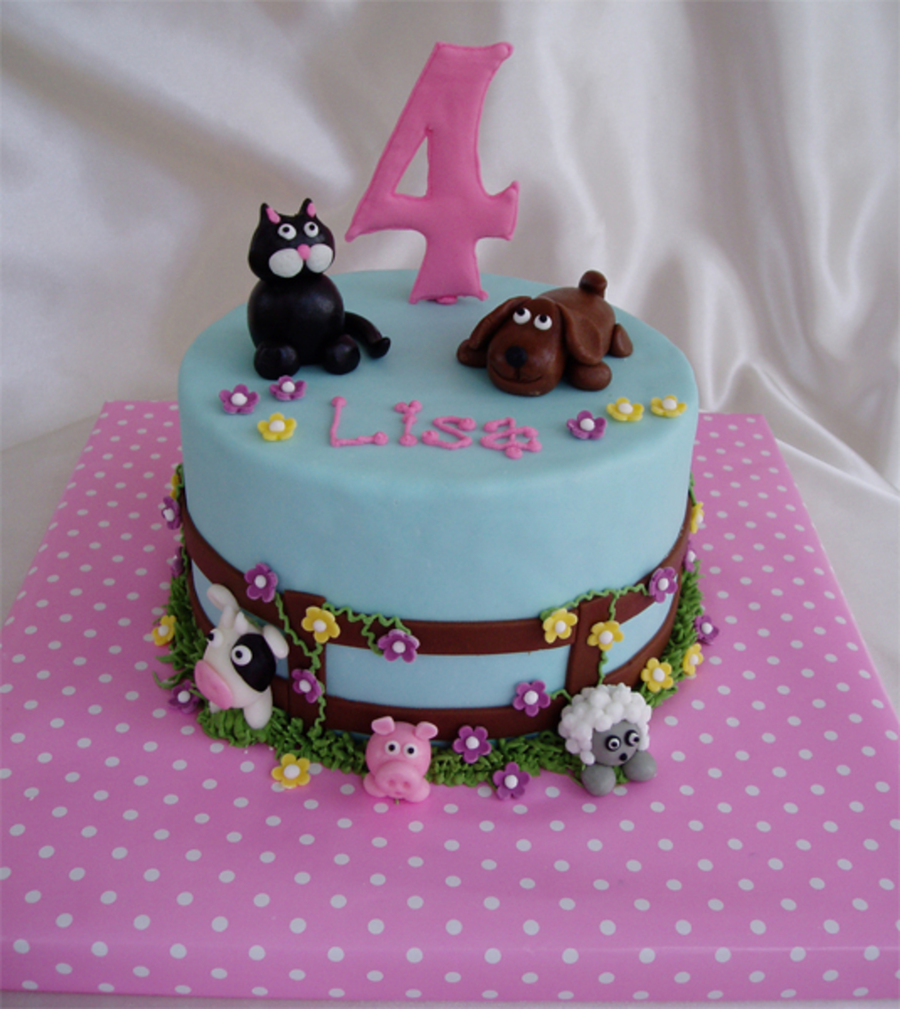 This little girl wanted different farm animals and a cat and a dog. I got the inspiration on how to make the animals from many different cakes here on CC. Thank you! The 4 is made of royal icing, all the rest is MMF.
