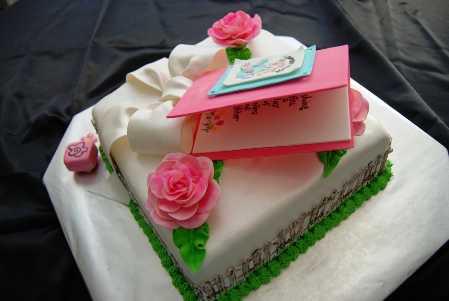 My best friend loves Stamping up and makes all of her cards using the stamps so I thought it would be fun to make her cake with that theme. The picket fence was a stamp as was the entire card. I made a stamp and put it beside the stamped flowers. This was such fun to make and it was the hit of the party. I put sparkler candles on it.