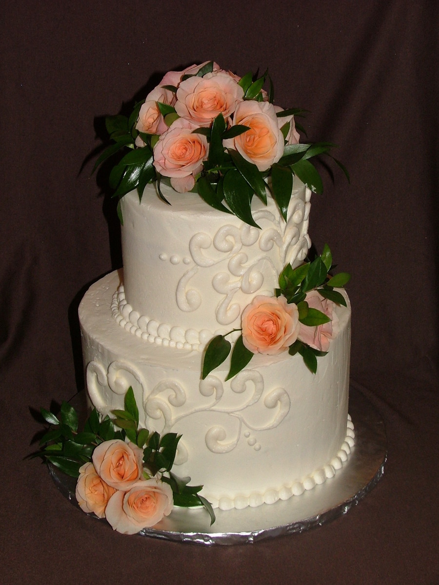 This was for a small wedding reception. Simple swirls on buttercream and fresh peach roses.