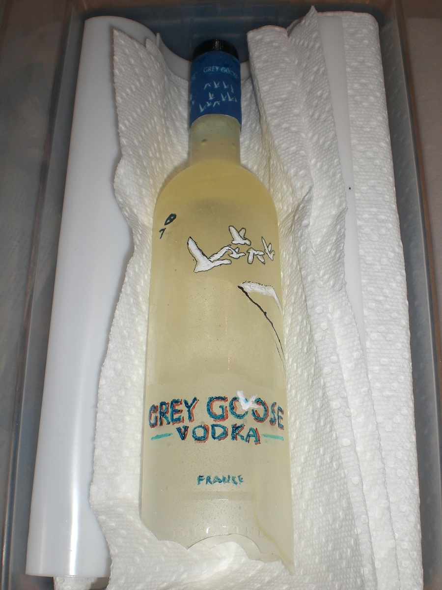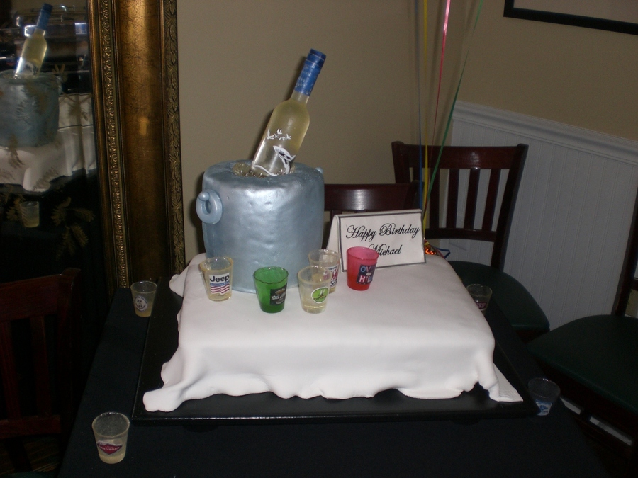 Grey Goose birthday cake. Hand painted sugar bottle and sugar shot glasses. Ice bucket made out of rice krispy treats with fondant painted in silver food color. Chocolate cake with Chamboard genache. All edible.