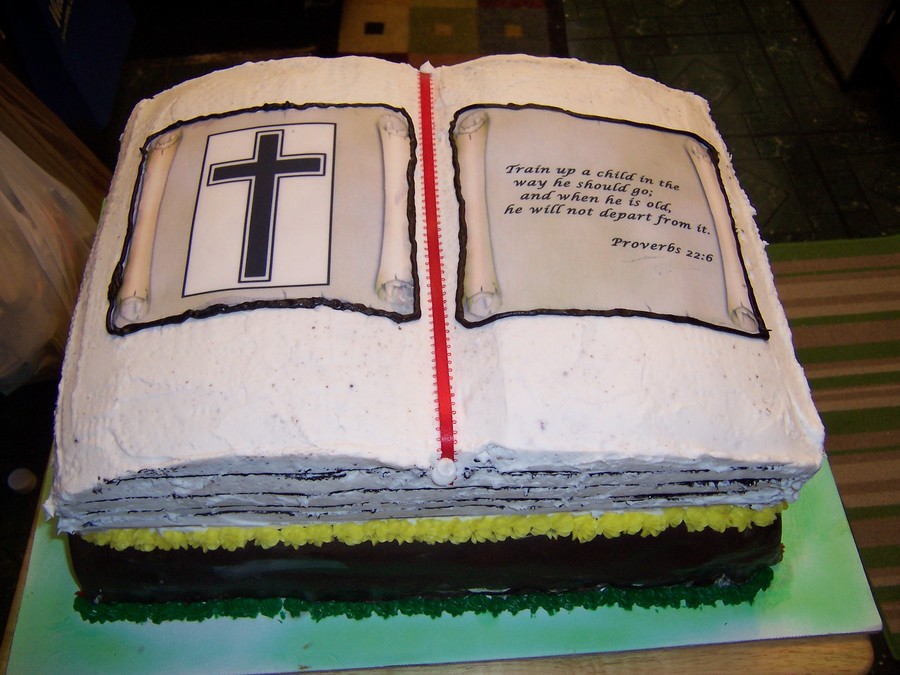 bible cake made of chocolate with buttercream frosting bottom layer yellow-with chocolate fondant
