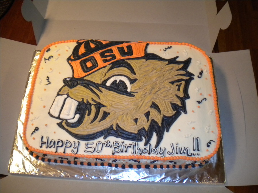 I did this cake for a client that went to OSU and loved the Beaver logo! The cake is covered in white buttercream and then I hand piped on the OSU Beaver logo.