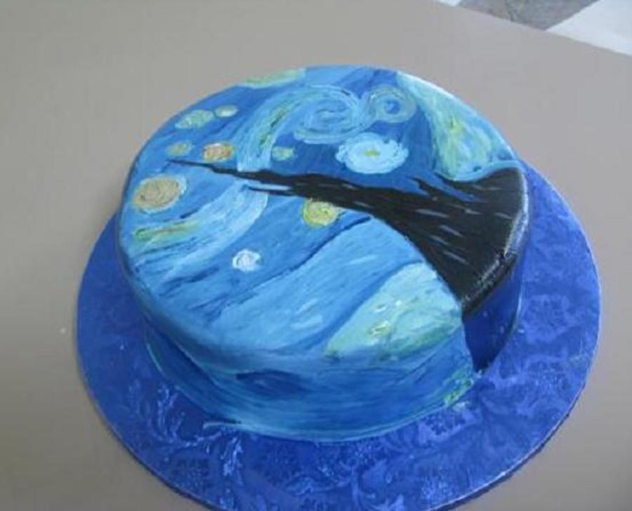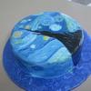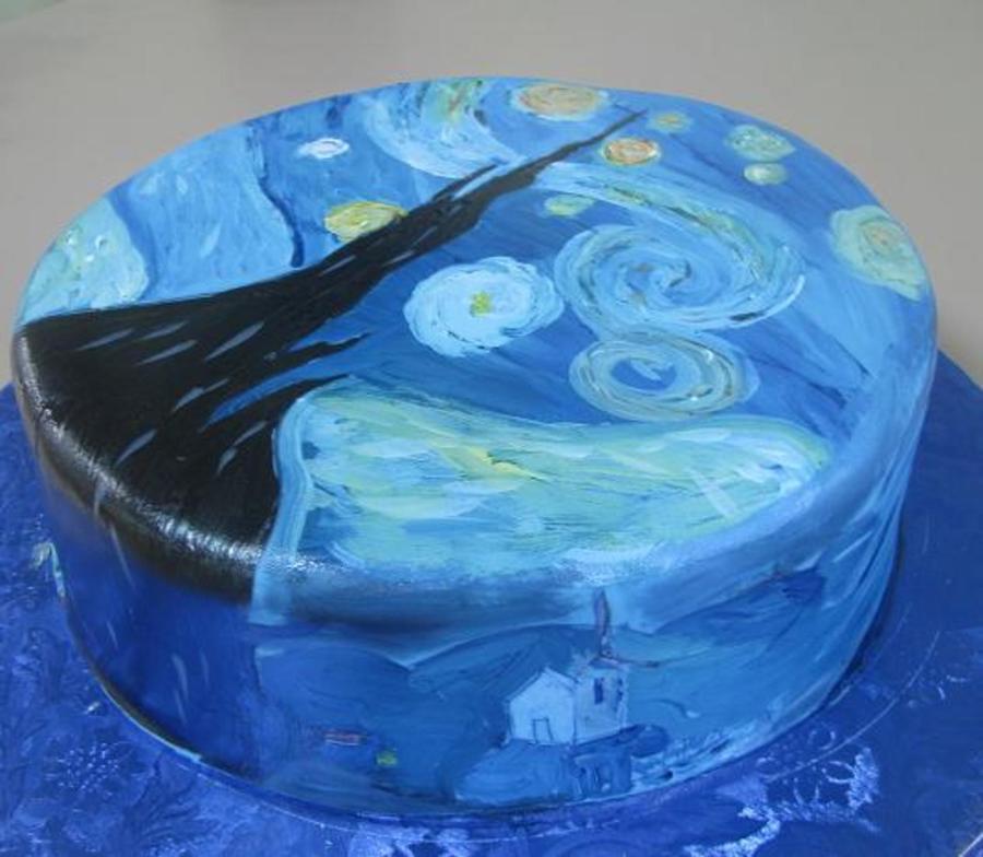 my interpretation of van gogh's starry night. customer wanted thius for a friend who loves this painting. i colored fondant medium blue, sketched out major elements on cake with food marker then painted it .