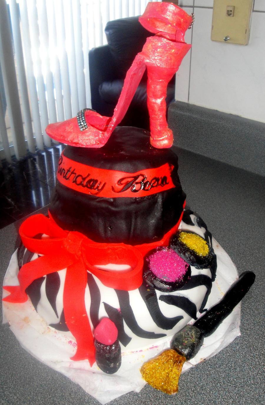 I made this for my cousin's bday. Bottom tier is Oreo Chocolate with a layer of Oreo Chocolate ganache and another layer of caramel with coconut & pecans. The top layer is marble with chocolate fudge layer. Covered in Fondant. Gumpaste Shoe and makeup accessories.
