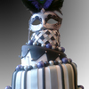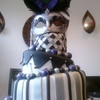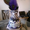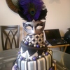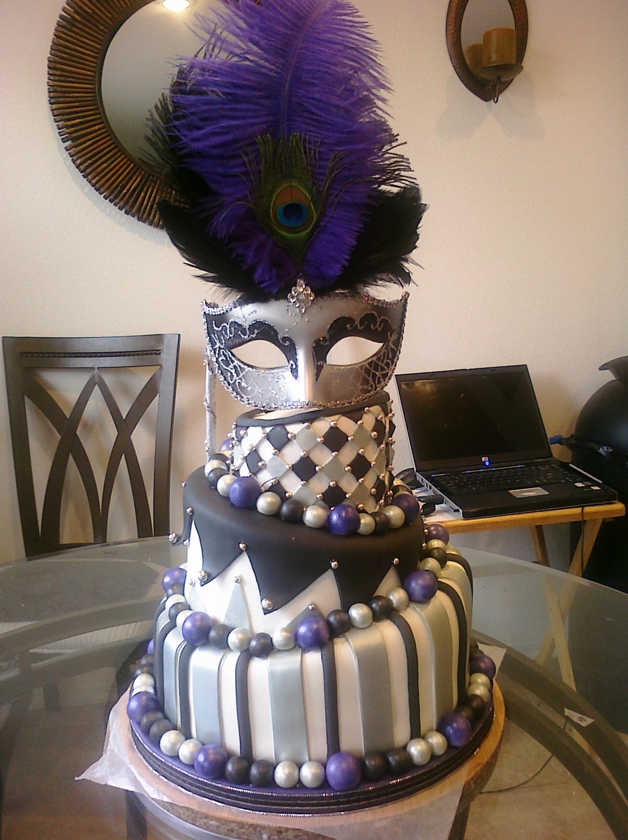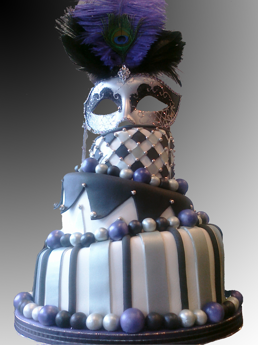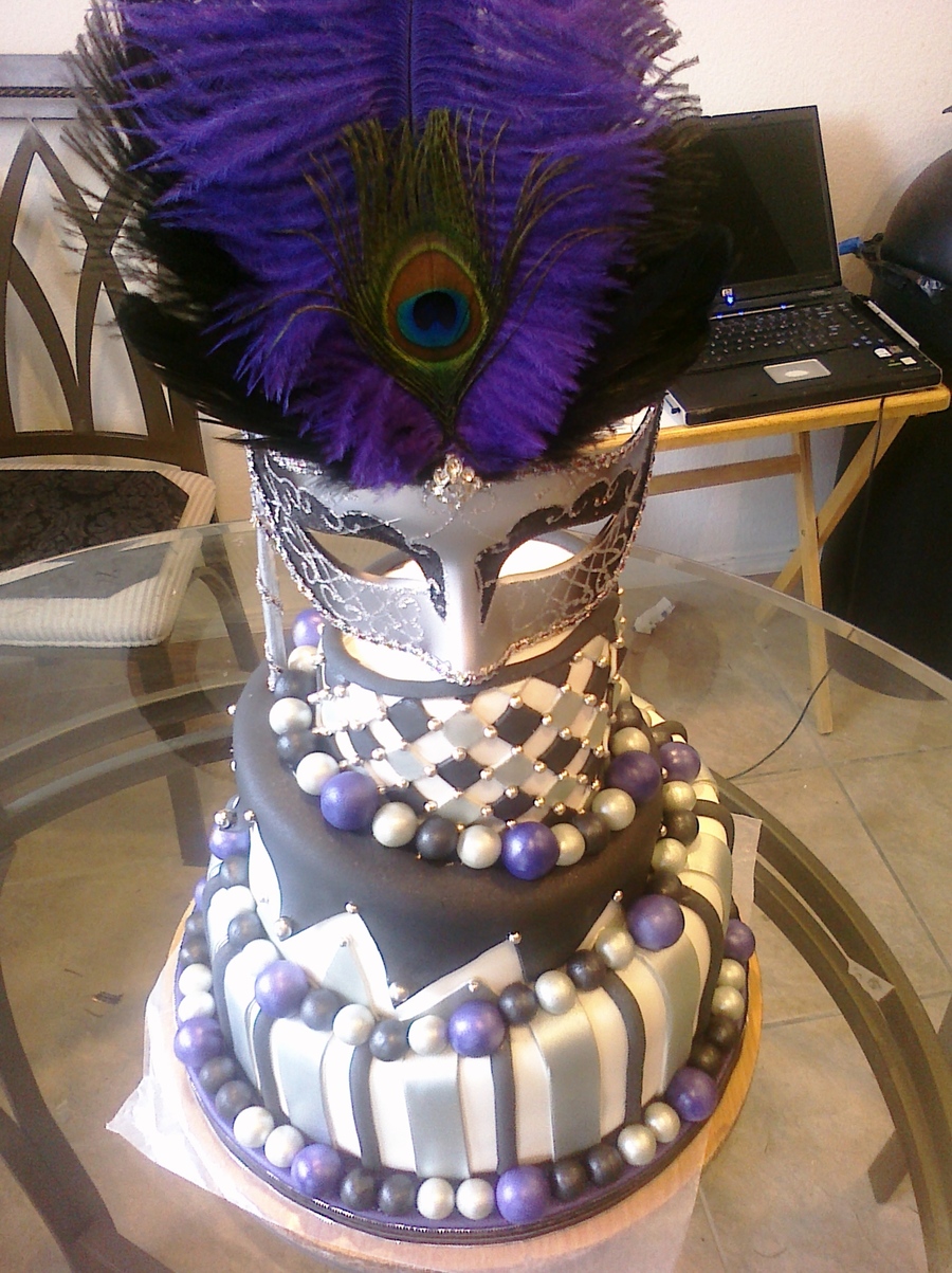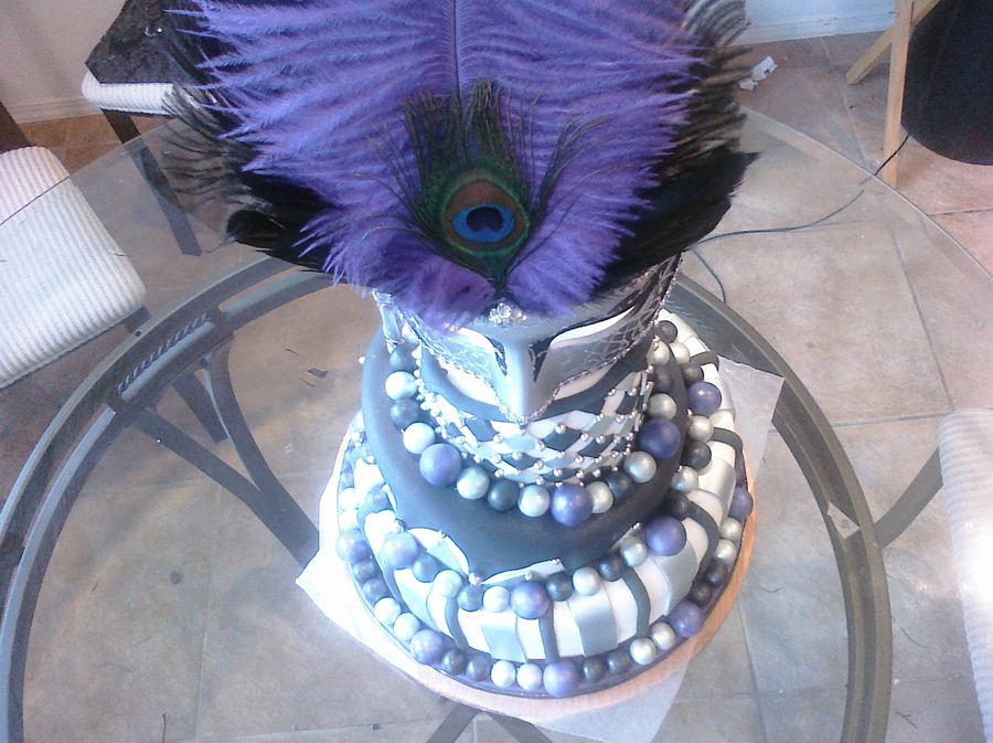 I made this cake for a themed bridal shower. It was so much fun to make. the bride's colors were silver and black. I airbrushed all the silver on the cake in the americolor silver sheen.I also airbrushed the purple as well in a base of flat violet and then hit it with a lavender sheen over the top the purple really popped on the cake. i then customized the mask by hot glueing colored feathers of my choice onto the mask. This was my first 3 tier topsy turvy cake. I had a blast making it.