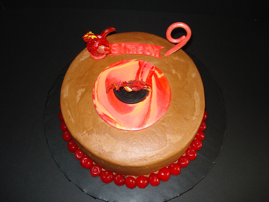 This was made for Simeon's 9th birthday. He requested a chocolate cake with chocolate frosting with cherries and Bakugan and/or a guitar. I purchased a toy pack to use for the decorations, which he gets to keep. The swirled disk under the dragon, the name banner, and the nine were all made from fondant. The bottom border is a ring of cherries. His mom said she couldn't wait for him to see it.