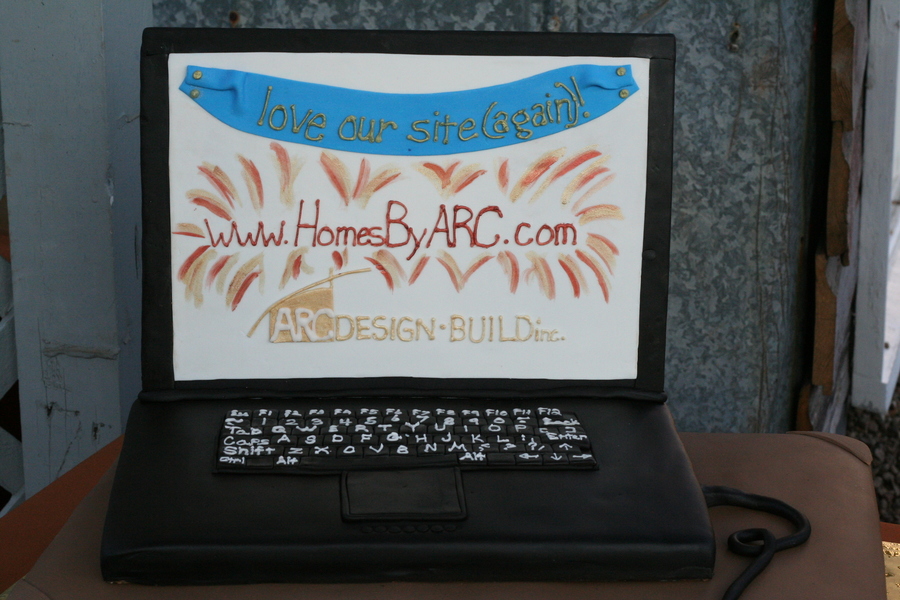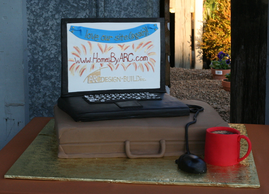 My very first 3D cake! So much fun!! Everything except the computer screen is edible. The screen is a foam core board covered in fondant with freehanded logo to match the company's actual logo design. This cake was to celebrate the launch of the new company website at a big "Launch Party" . The coffee mug and mouse are all cake too. I think the mug is probably my favorite of all. :-)