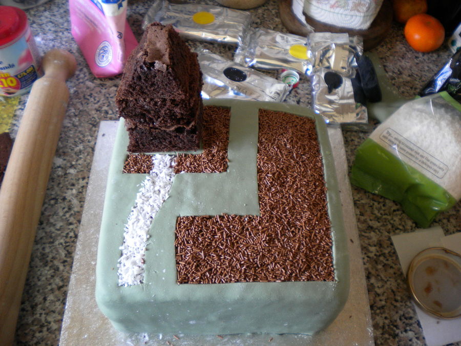 Three layered vanilla sponge, shed made out of chocolate brownie coated in melted chocolate. "Compost" is chocolate sugar strands, footpath is desiccated coconut. veg all made out of fondant icing and the bean sticks out of cocktail sticks.