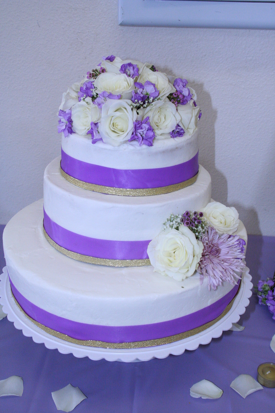 I made this cake for my grandparent's 50th wedding anniversary. THe flowers are real. The cake was my first attempt at something so large. It shifted in the drive to the church. Everyone still liked it.