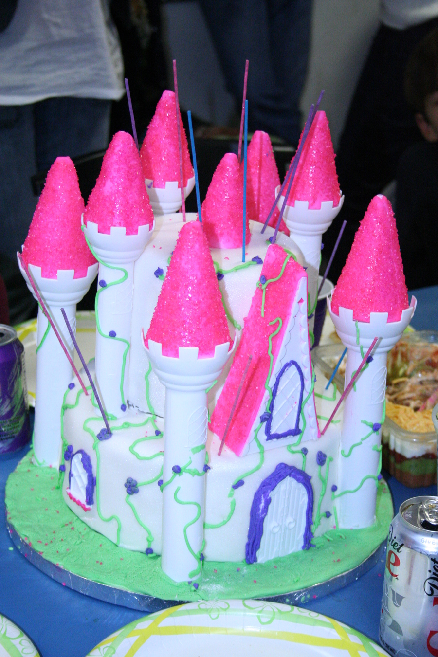 This cake uses the Wilton castle parts. It was my first time using it. I covered each cone with pink fondant and then rolled them in pink sugar. IT is only a two layer cake with fondant covering.