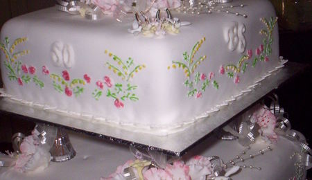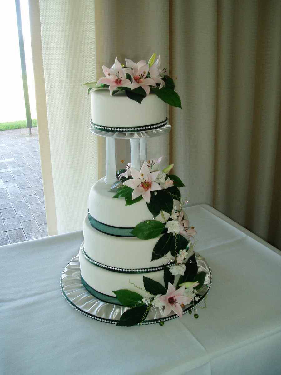 my sons wedding cake.first attempt at decorating. sugar lillies and leaves.painstakeingly hard to do but i think the overall effect is nice.
