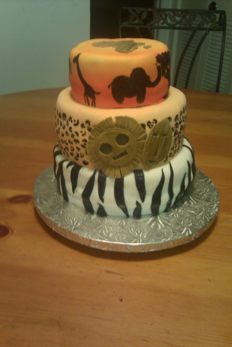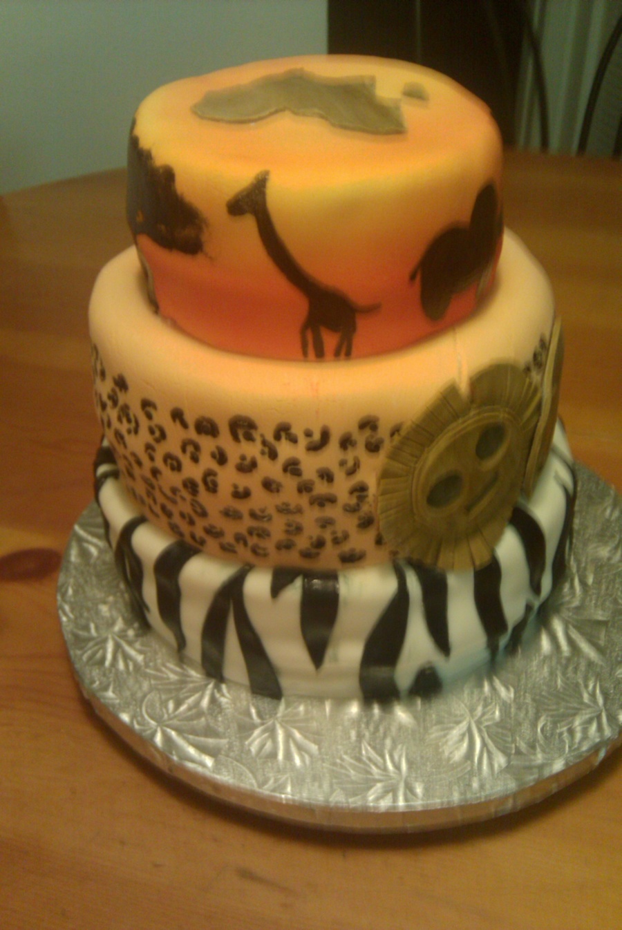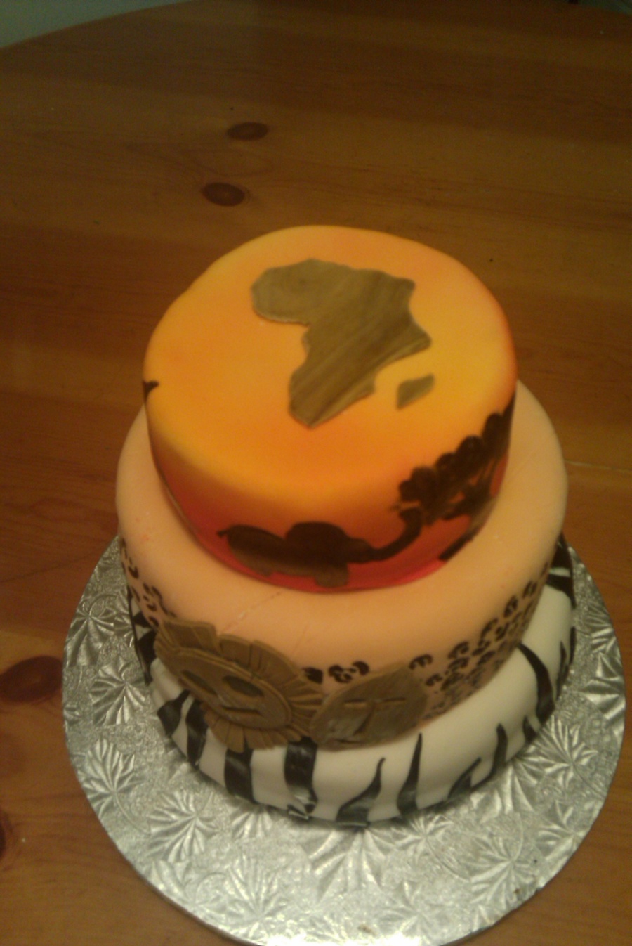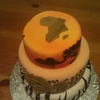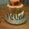Inspired by another cake on CC by jackieLowson, this cake was for an African American themed celebration at a school. It was for the entire staff of the school and no one wanted to cut into it! When they finally did, I was told it was delicious. Chocolate with Bavarian Cream filling. Three tiers, bottom zebra is black and white fondnt, middle tier is dyed fondant with hand painted leopard print, and top tier came from the inspirational cake on CC...dyed fondant and hand painted African savannah scene....jackieLowson did a MUCH better job piping hers. I hope that immitation is considered flattery in this case!!! I was disappointed at the fact that it was a little lopsided...I love the way my Africa turned out at the top.TFL!!