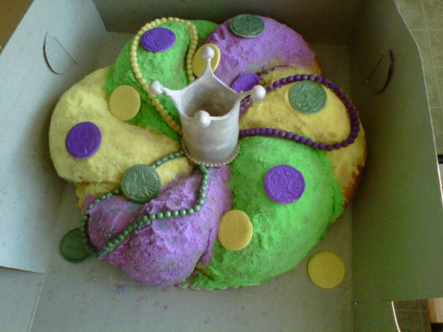 A kings cake for Mardi Gras. Covered with colored sugars and gumpaste coins, beads and crown.