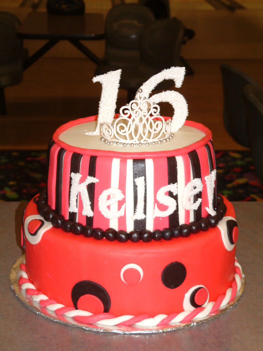 This was a young lady turning 16. She wasnt having a big party, but wanting a big cake. The tier on the bottom is just a dummy cake and the top tier is the real cake. Covered in marshmallow fondant and stenciled the numbers and letters from gum paste and sprinkled with sugar crystals.