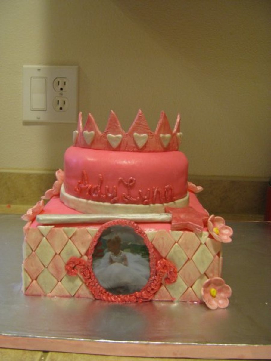 This was an order for a 4 year old birthday. This was completely sugarfree cake minus the fondant work. * in square and 6 in round. The tile work is all hand cut fondant. The image was printed in eddible ink and attacked to gumpaste. The crown, flowers and wand are also gumpaste.