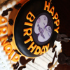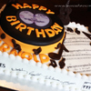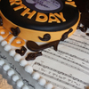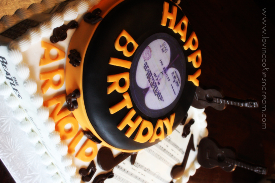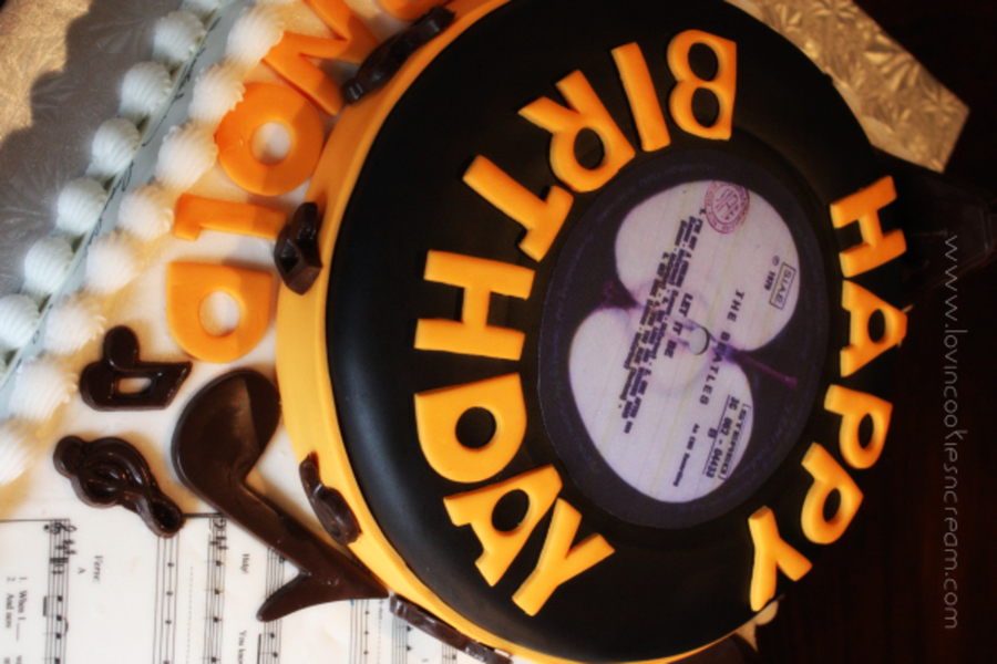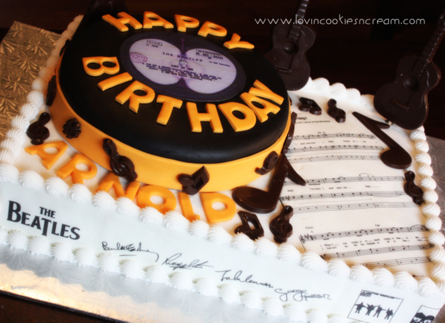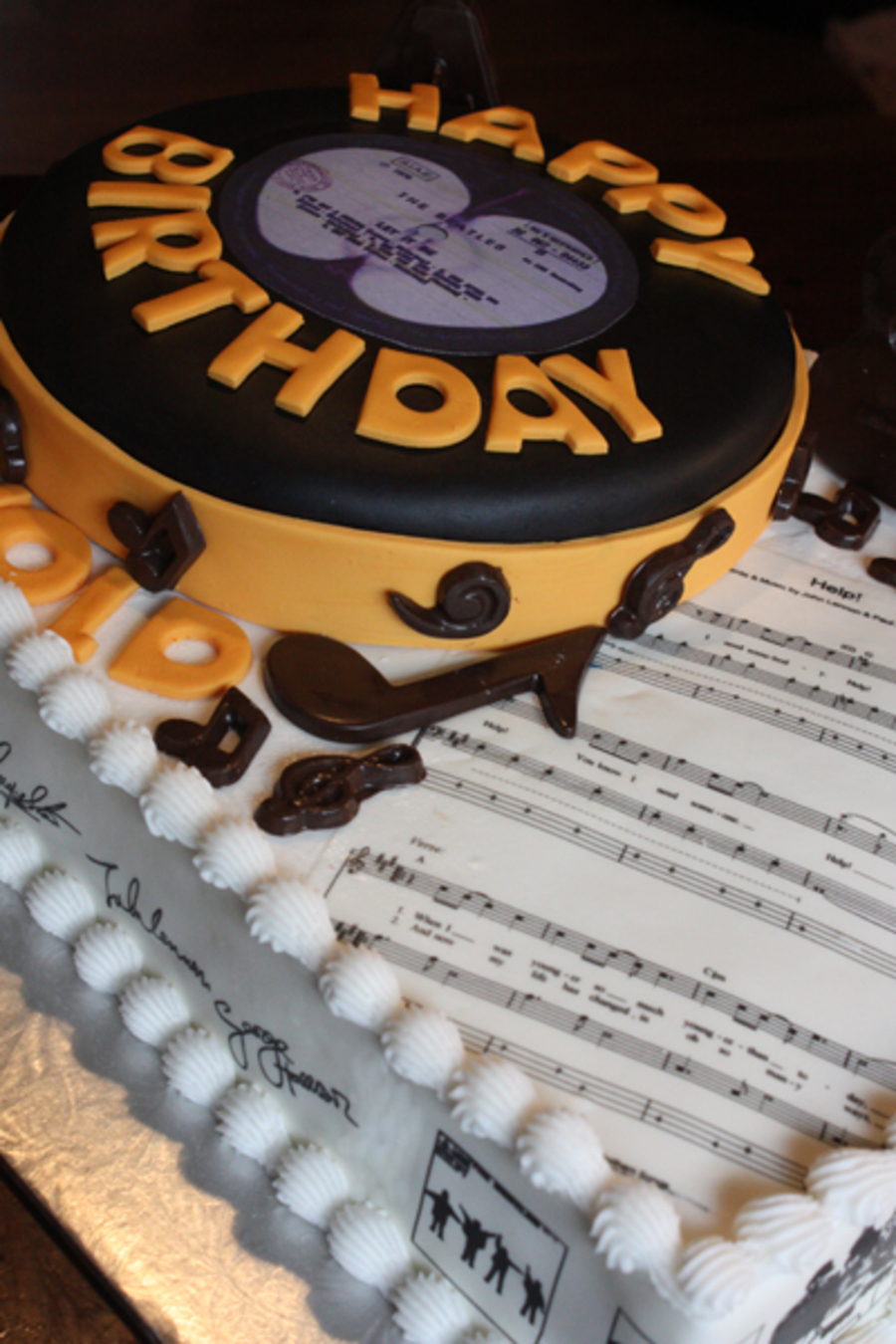 Record is a 10" round cake on top of 1/2 sheet cake. The guitars and music notes are molded chocolates. The Beatles logo, signatures, song lyrics to "Help" are all printed on edible sugar paper