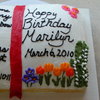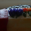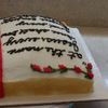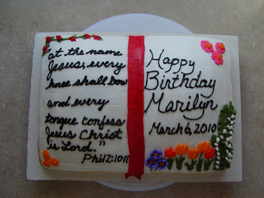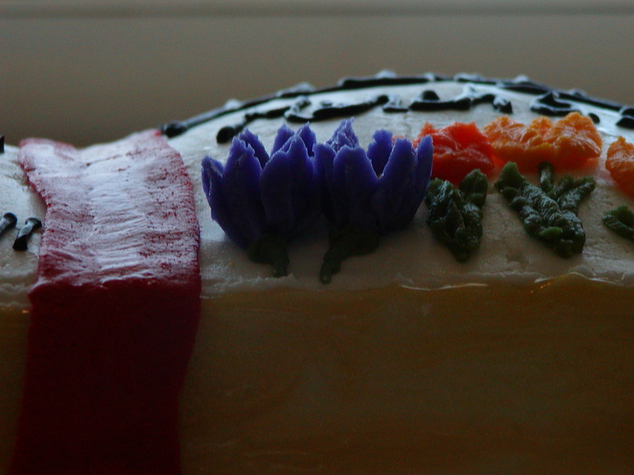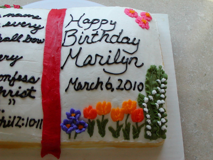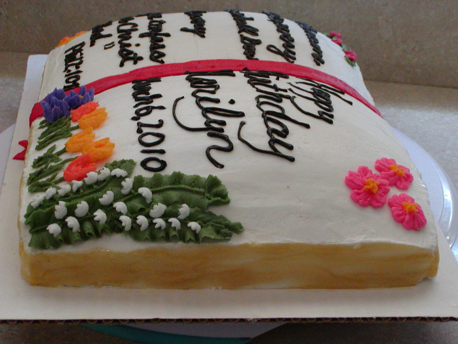 This is a 9x13 cake carved to appear like a Bible. The recipient wanted lily of the valley (tip#70 for leaves, tip#81 for flowers). Then I wanted to add other spring flowers, so I just figured out the crocuses and tulips with different tips. All buttercream frosting.
