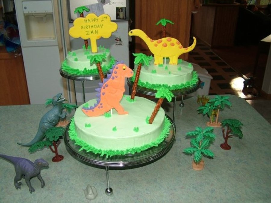 dinosaur cake with whipped icing and color flow dinosaurs.