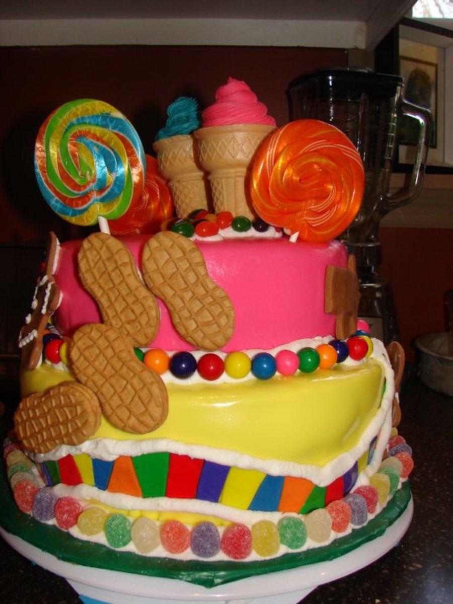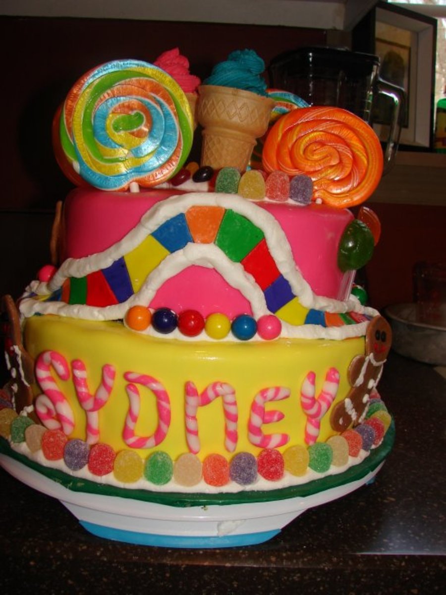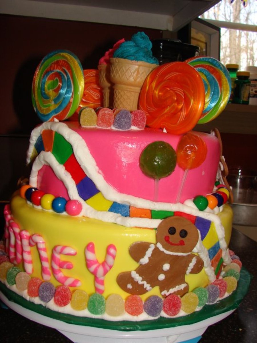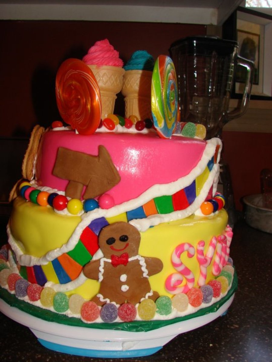 This was my dd 6th birthday cake, candyland was the theme. 2 layer 10" and 2 layer 8" all mmf. Thanks for looking!