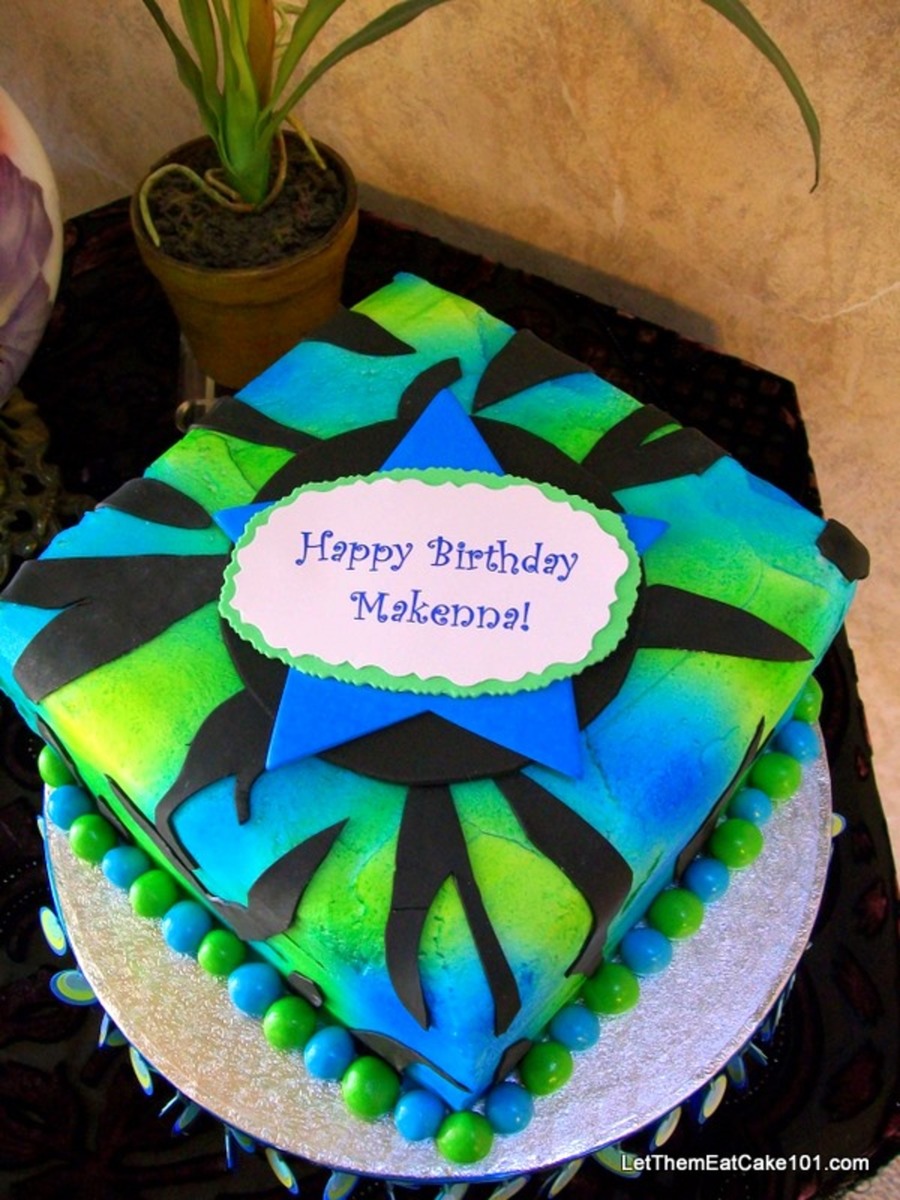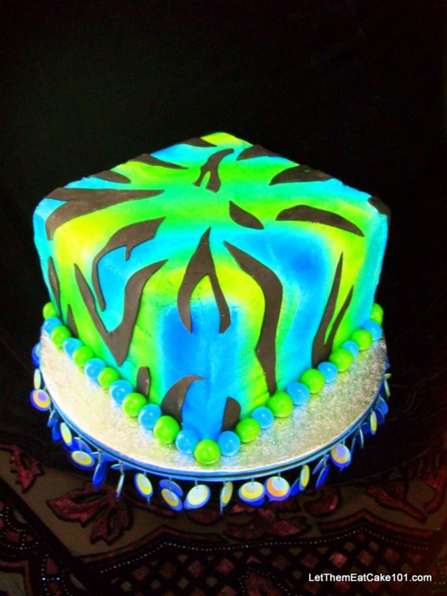 Zebra cake airbrushed buttercream with black fondant accents.