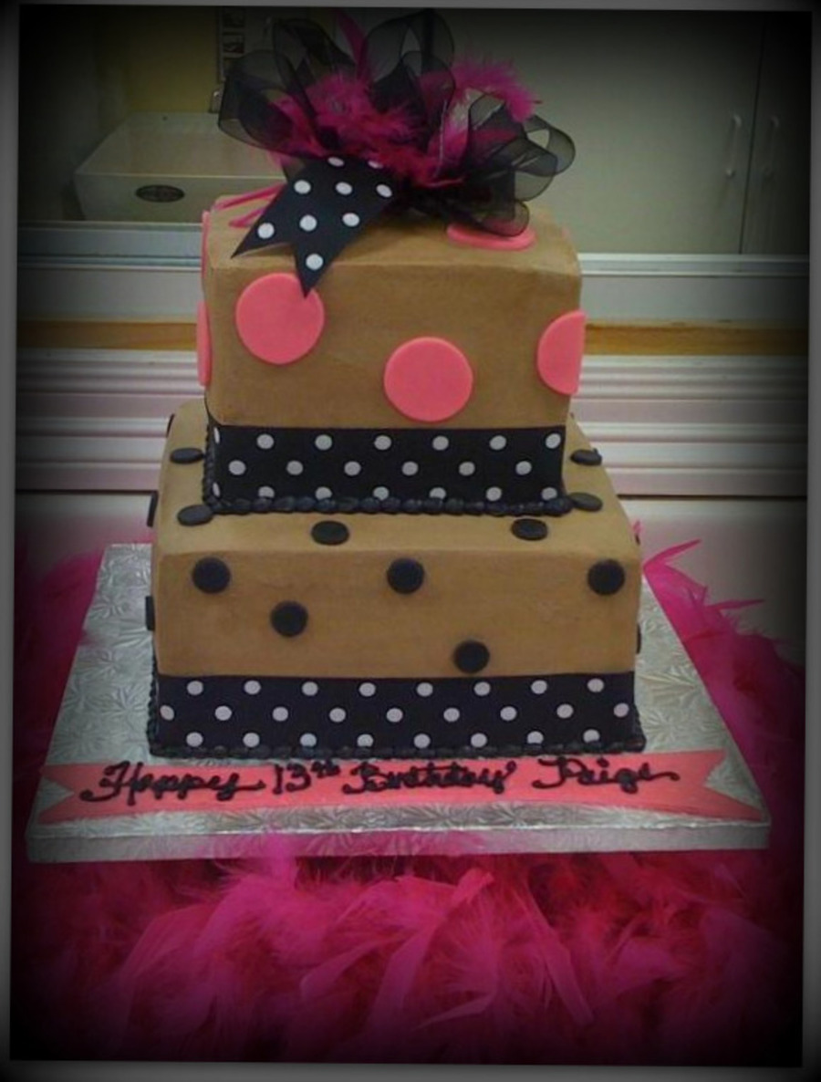 Chocolate Butter Cream Cake (6 & 8 Square) with Fondant dots. The band and topper bow are ribbon.