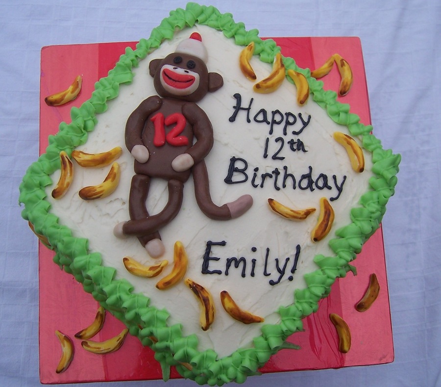 A gluten-free cake for a sock monkey party. Since marshmallow molds sometimes use flour, the cake is primarily decorated with buttercream - only the monkey and the bananas are fondant.