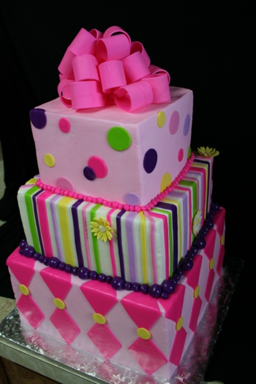 Cake was actually done for a baby shower. Individual wanted duplicate of my last cake, but square. My first buttercream covered square cake.......not too bad for my first time, but need much more practice to get those sharp side edges. Bottom tier was white chocolate cake with strawberry cheesecake filling, middle tier was strawberry cake with cream cheese filling and top tier was vanilla cake with chocolate cookies n cream filling. All decorations were marshmallow fondant and bow is gumpaste. TFL!