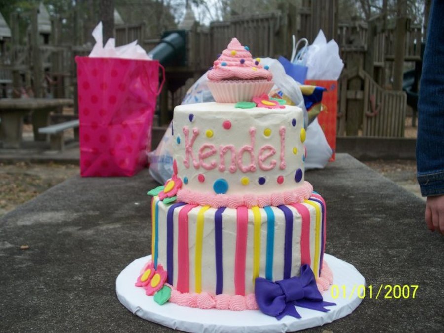 this is a 6" & 8" cake with a standard size cupcake on top. The board is a 12" round. It's all buttercream with fondant accents. I make this one for a little girl that loves rainbow colors. She couldn't pick a color, so she said she wanted them all. It was for her 6th birthday. Had no idea where to stick the candle, plus it was outside and too windy.