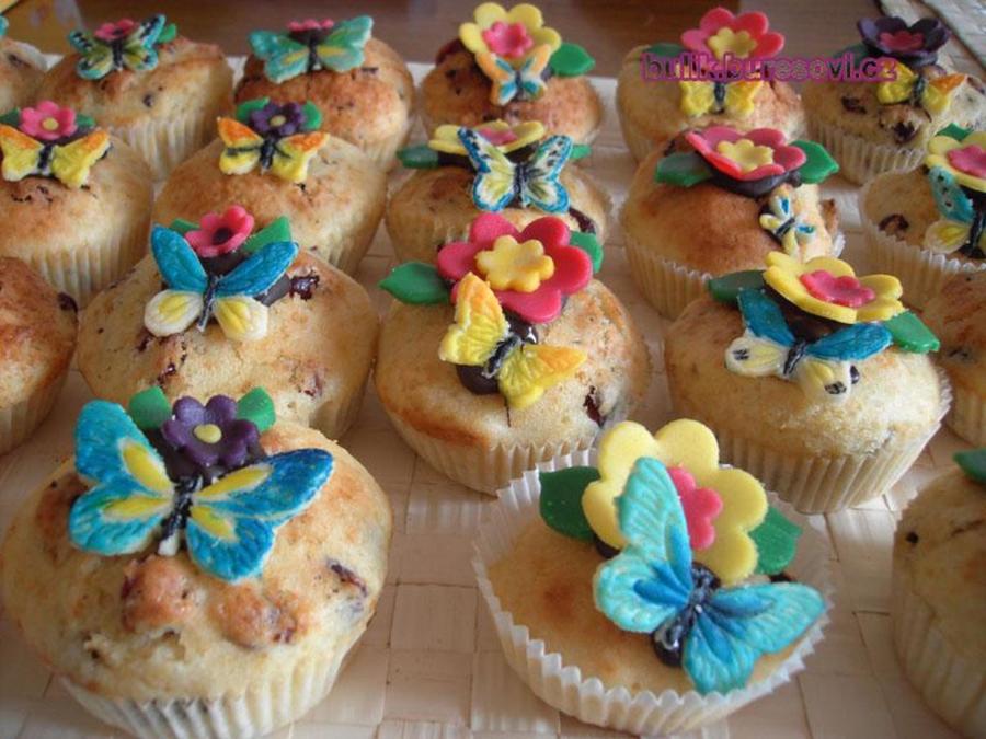 Dough with sour cream and cranberries. Marzipan butterflies and flowers.