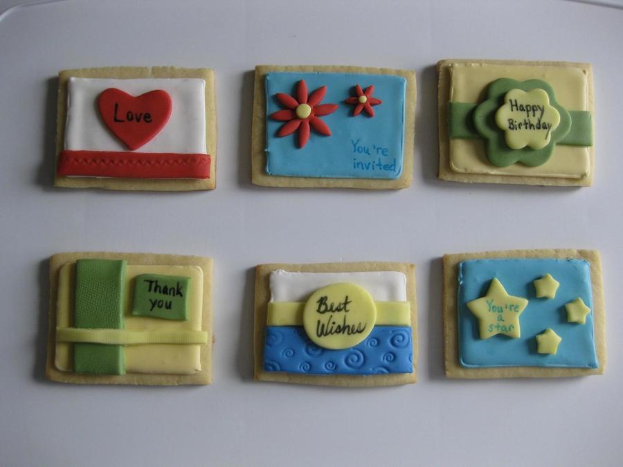 I made these sugar cookies for a card making party. The cookies are covered with royal icing and then decorated with fondant accents. I've designed the cards to look like greeting cards. Thanks for looking.