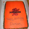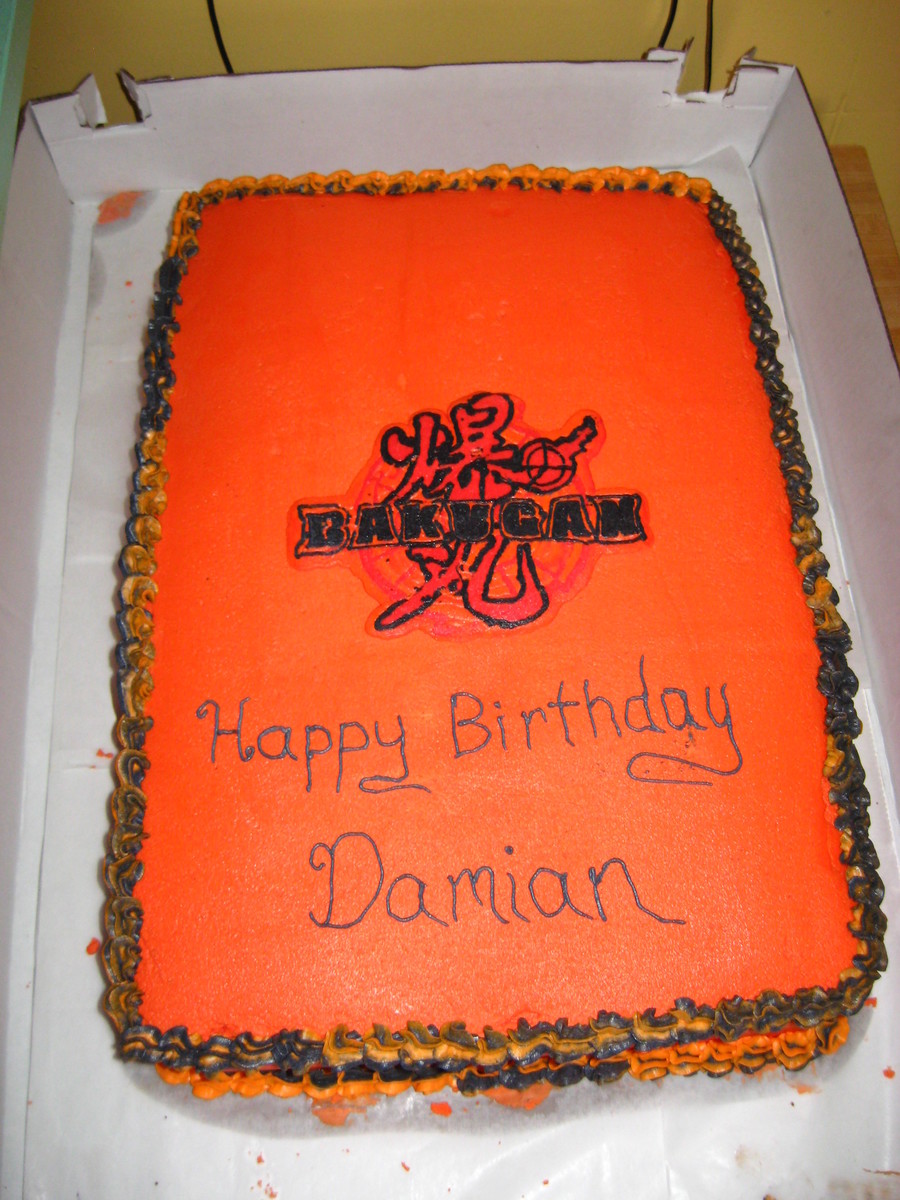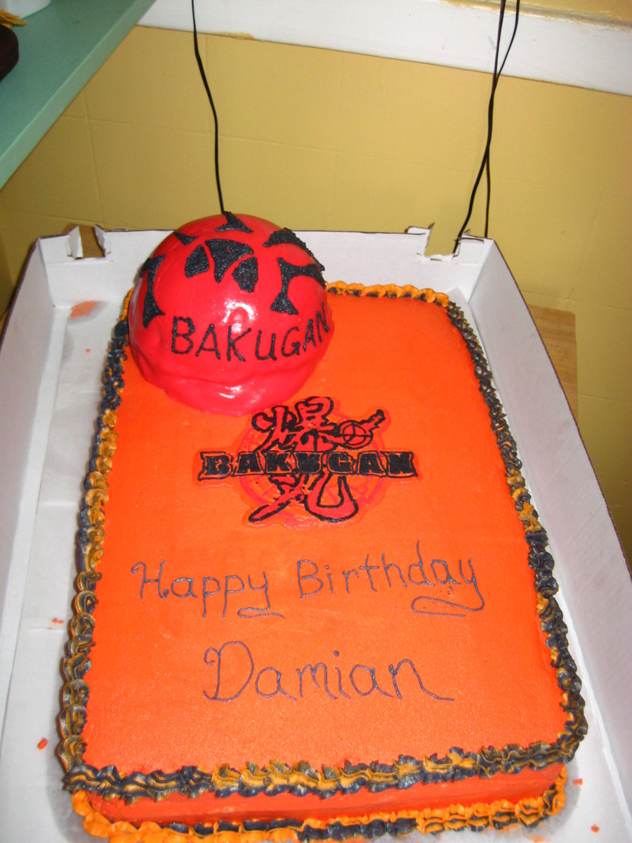 Golden/Chocolate Cake with Devils Food Cake Bakugan Ball. Ball is covered (badly) with MMF. Cake is buttercream icing but I had a tough time getting it a little more redder so IMO it is too orange. I didn't enlarge the logo enough when I printed it up so I couldn't get all the details for my FBCT logo.