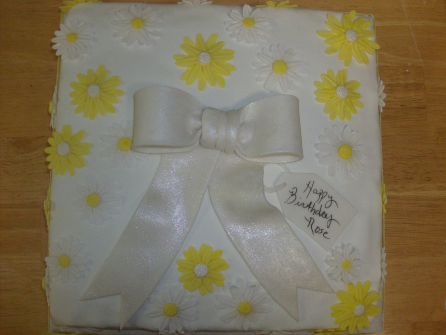 12' yellow cake with marzipan filling and covered in MMF. Bow , daisies and gift tag all gumpaste.