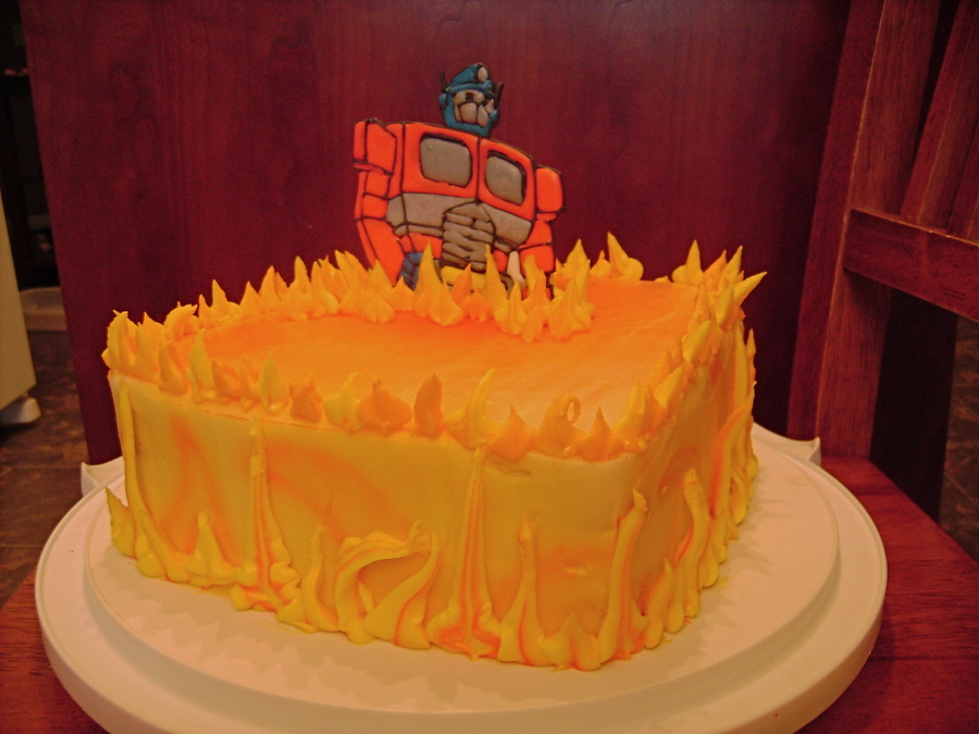 Iced in buttercream. First day using airbrush. Color flow transformer. Buttercream flames.