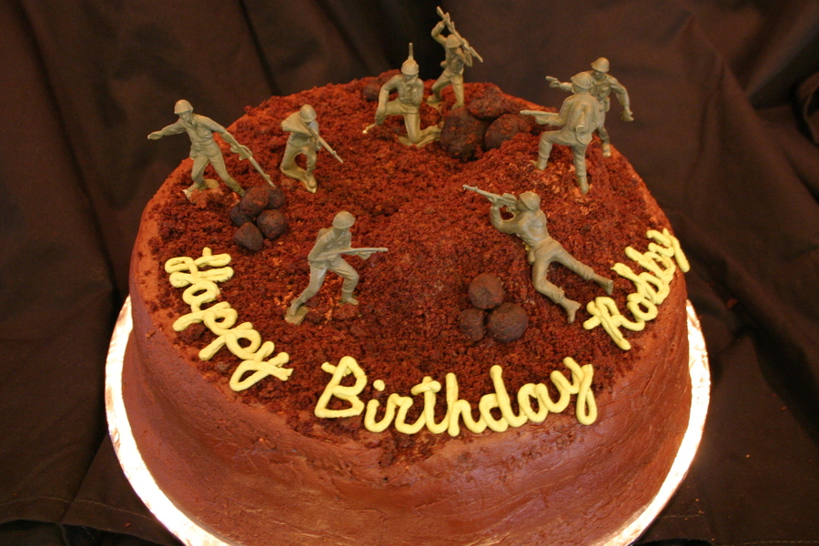 I had a request to do a cake for a boy who wanted these army men and dirt on his cake. I used cake crumbs for dirt, and I attempted to make the sides rough to resemble a rocky terrain.