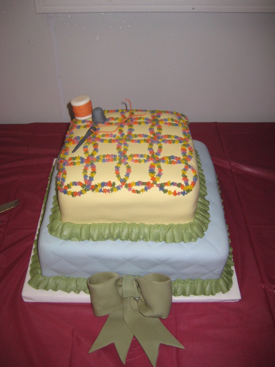For my grandmothers 80th birthday. covered in fondant. wedding ring pattern and ruffle border are buttercream. it took forever to get the quilt pattern to line up right. I have a new respect for my grandma and her quilting.