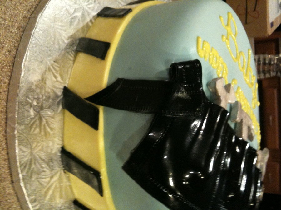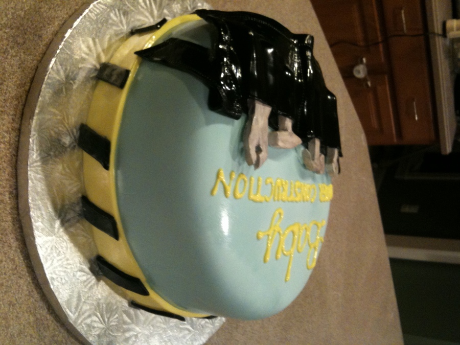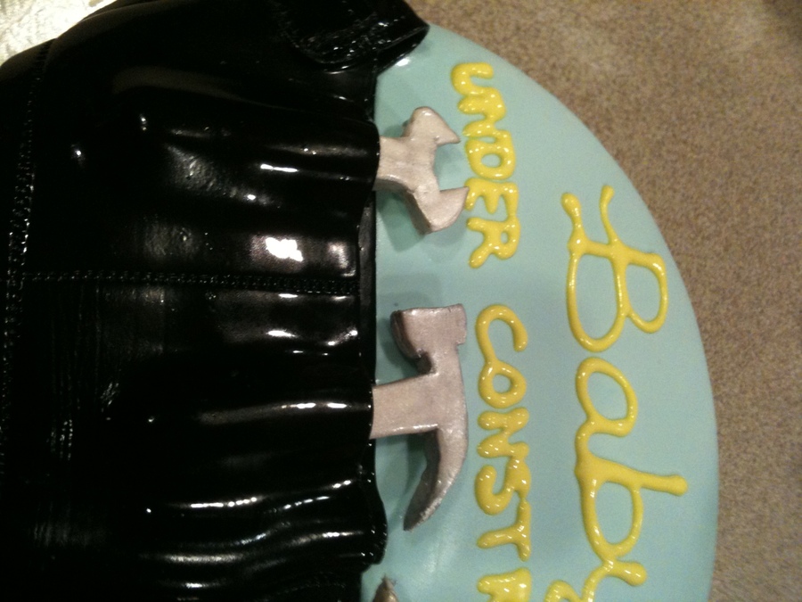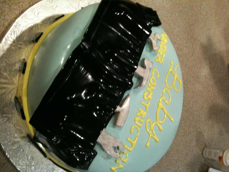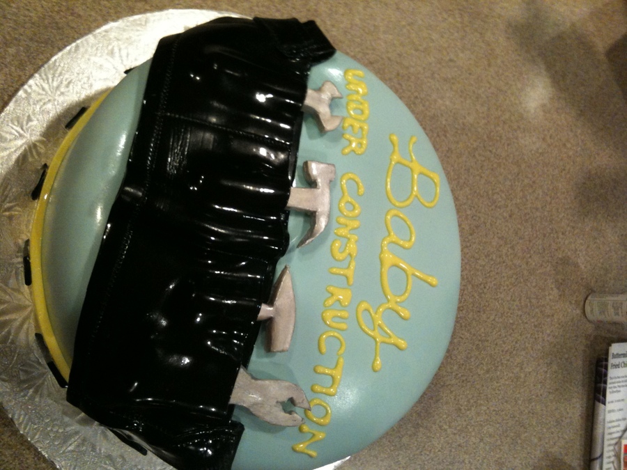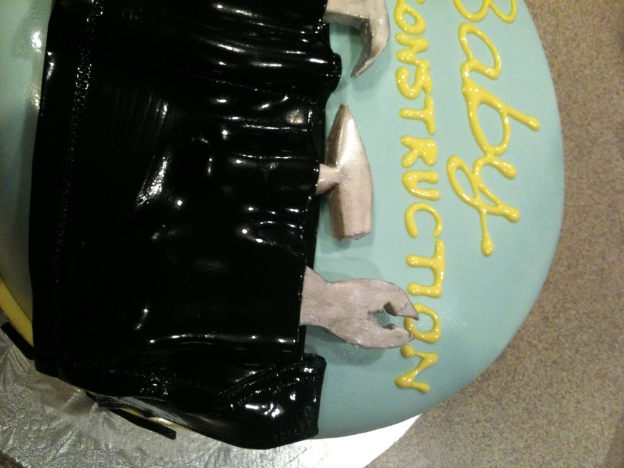 This is a cake I made for a friend who is expecting a baby. Since my friend is a guy, I wanted to keep the cake somewhat masculine. The cake is a two tier chocolate fudge cake with a chocolate mousse filling. The cake was then covered in buttercream frosting and fondant. The tools are gumpaste and the tool belt and construction border is fondant.