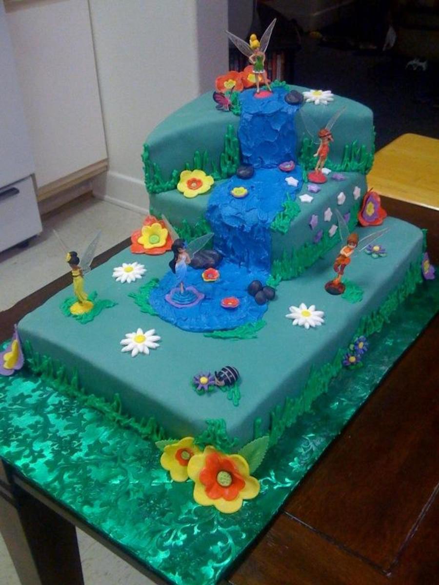 Tinker Bell cake. Covered in fondant with buttercream river and fondant accents.
