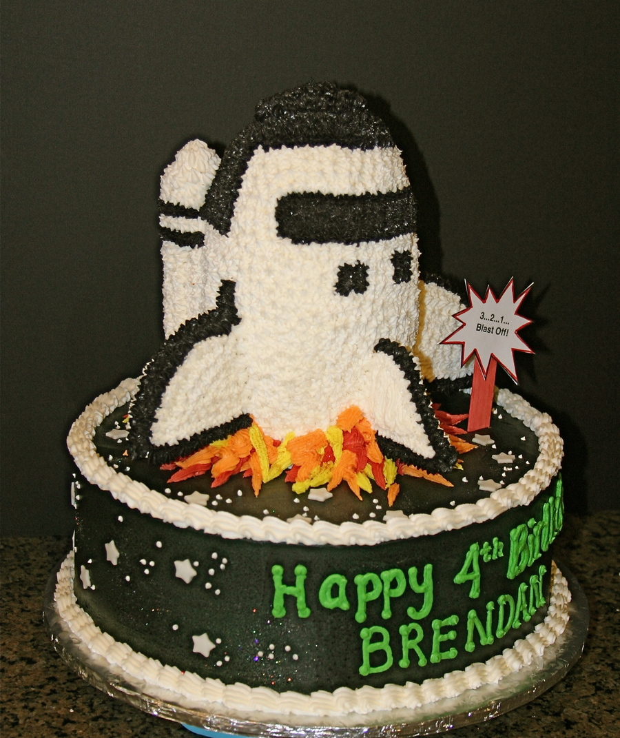 A 10" round cake base with 4" stacked cakes for the shuttle and krispie treat "jet packs". The cake was triple chocolate fudge with oreo filling - a popular combination this week. All icing in buttercream. I was really worried the shuttle would fall so I triple doweled it and "glued" the heck out of it with the buttercream flames. The shuttle made it to the party and was even removed and taken home.