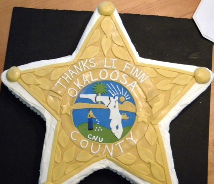 This cake was made for the Lt of Okaloosa County Sheriff Dept. Cake is white cake, buttercream icing, and fondant accents. This is a replica of their county badge.